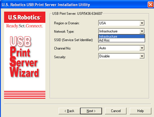 The Wireless USB Print Server is initially set in Infrastructure mode.