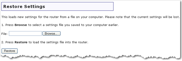 If you ever lose your settings or if your settings have changed and the router is not functioning properly, you can restore your saved settings from a backup file. If you did not create a backup file, you may need to restore the default settings.