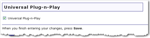 Select Universal Plug-N-Play to enable Universal Plug-N-Play, or deselect it to disable the feature. After you change this setting, you need to click Save to apply the new settings to the router.