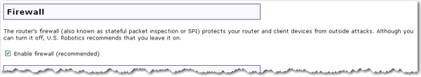 If you deselect the checkbox next to Enable firewall, the firewall will be disabled, but this is not recommended. The firewall is used to block unauthorised users from accessing the network or any of the network resources. A firewall is one of the most critical pieces of security you can use in your network.