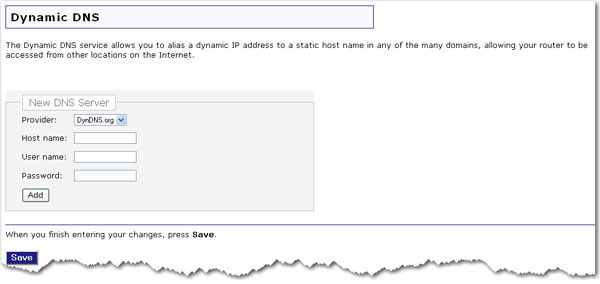 In this page, you can set parameters that will allow the domain name services to find your gateway. You would use this to bypass the dynamic nature of WAN IP addressing, to have a consistent host name accessible from the Internet.