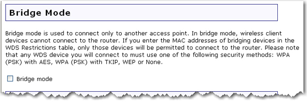 Bridge Mode is used to connect two isolated networks wirelessly. If this feature is enabled, wireless clients will not be able to connect to the router. Bridging is used if you are trying to connect two networks or two groups of wired clients, each with its own router or wireless access point, that cannot be conveniently connected using Ethernet cabling. An example of this type of situation would be two homes that want to share network resources without running cabling through their yards.
