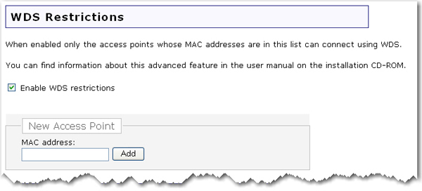 Enter the MAC addresses of the wireless routers or access points that will connect to this router and click the Add button.