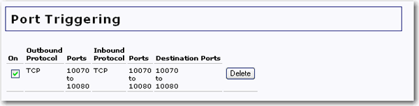The router comes with a default Port Triggering rule that you will need if you are connecting a Sony Playstation2™ that needs to access the Internet to your router. To enable the rule, select the On checkbox for the rule. This page also details how you could create your own PlayStation2™ Port Triggering rule.