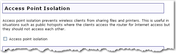 If the router will be used in a public place where you do not want any wireless clients to be able to share files or printers between themselves, select Access point isolation. With this selected, all of the wireless clients will only be able to access the Internet. An example of a situation where you would want to enable this feature is in a public hotspot, such as a coffee shop or hotel. This feature is disabled by default.