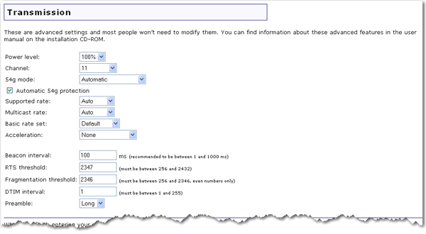 The fields in this area are for more advanced wireless features that most people do not need to change. If you do want to change any of these settings, write down the default settings before you make any changes in case you experience any problems and need to change these settings back.