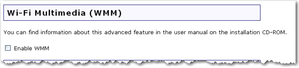 This feature is disabled by default. If you want to enable this feature, select the checkbox next to Enable WMM (Wi-Fi Multimedia). The other devices that you are connecting to in order to use this feature must also support WMM and have it enabled.