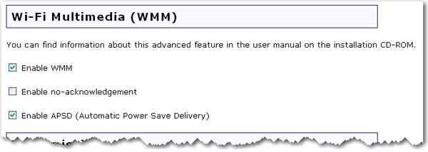 With WMM enabled, you can also select Enable APSD (Automatic Power Save Delivery). APSD manages radio usage for battery-powered devices to allow longer battery life in certain conditions. APSD allows a longer beacon interval until an application requiring a short packet exchange interval starts. Voice Over Internet Protocol (VoIP) is an example of application requiring a short packet exchange interval. APSD affects radio usage and battery life only if the wireless client also supports APSD.