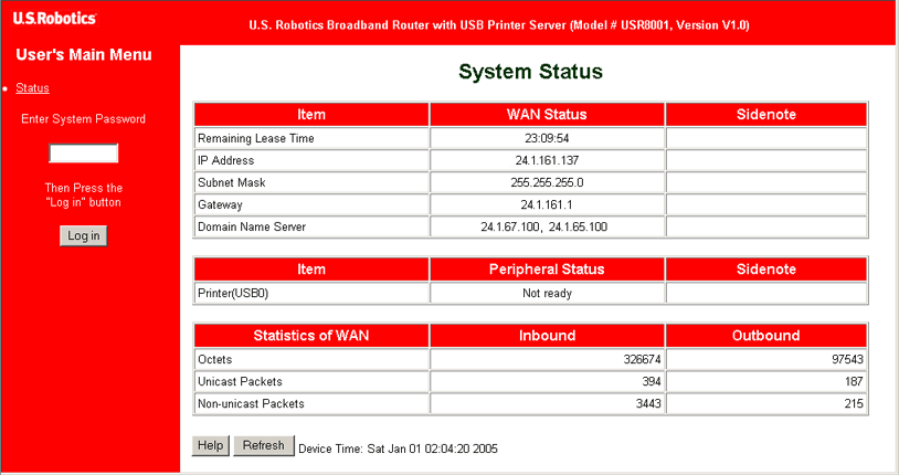 - When the User's Main Menu appears, click Log in—there is no default System Password.