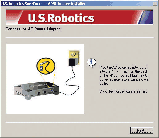 Turn on the router by pressing the power button labeled O / I. The PWR LED on the front panel of the USRobotics ADSL Ethernet/USB Router will be illuminated if power is being supplied to the router. The router will initialize after the power is plugged in. This process takes about a minute. Click Next to initialize the router.