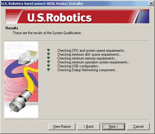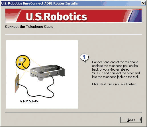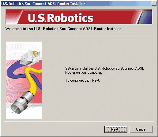 The USRobotics SureConnect ADSL Ethernet/USB Router Installer Welcome window will display. Click Next to continue installing the USRobotics SureConnect ADSL Ethernet/USB Router.