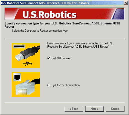 The USRobotics ADSL Ethernet/USB Router gives you the option to connect through a USB or an Ethernet port. Selecting how to connect your router is a matter of preference. Connection also depends on your available computer ports and the operating system that you use. For example, you must use an Ethernet connection with these operating systems: Windows 95, Windows NT 4.0, Macintosh and Linux.