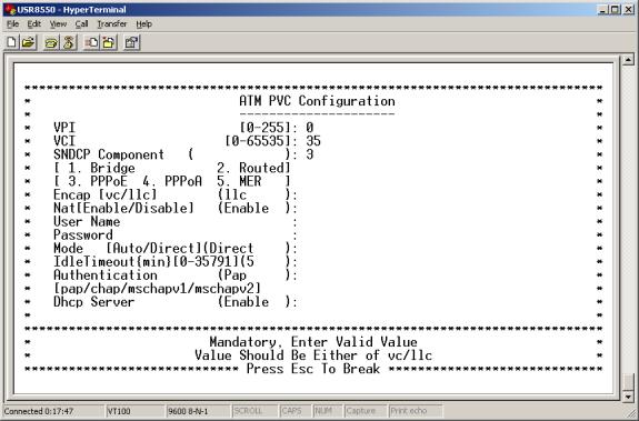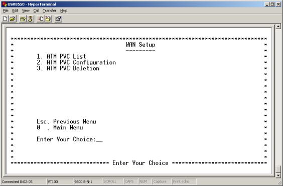 - Enter a 2 on the WAN Setup Menu. The ATM PVC Configuration Menu appears.