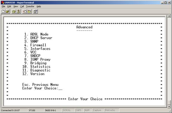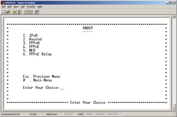 Choose 2 for ‘ADVANCED’, 7 for ‘SNDCP’, 3 for ‘PPPoA’, and 2 for ‘CONFIGURE PPPoA’.