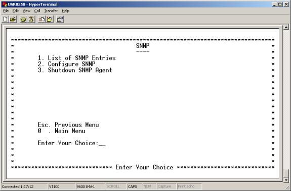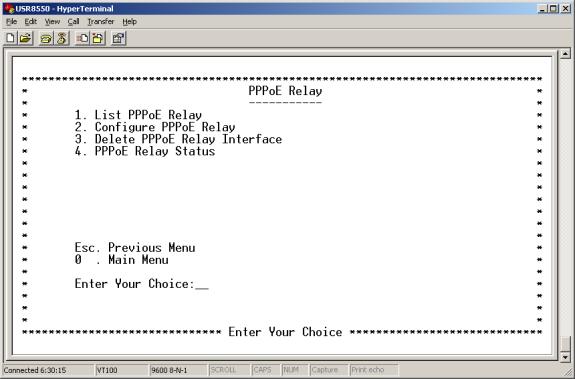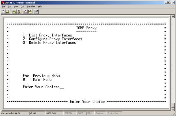 Enter 8 at the Advanced Menu. The IGMP Proxy Menu appears. This menu allows you to list, configure, or delete proxy interfaces.