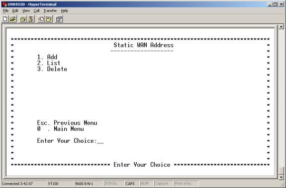Enter 3 at the Basic Menu. The WAN Setup Menu appears. This menu allows you list, configure, or delete ATM PVCs. Each option takes you to another screen.