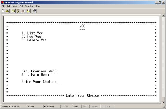 - Add PVC. Enter 2 at the Bridge Menu. The Add PVC Menu appears. This menu allows you to add a PVC by entering interface name, VCC, and encapsulation type variables.