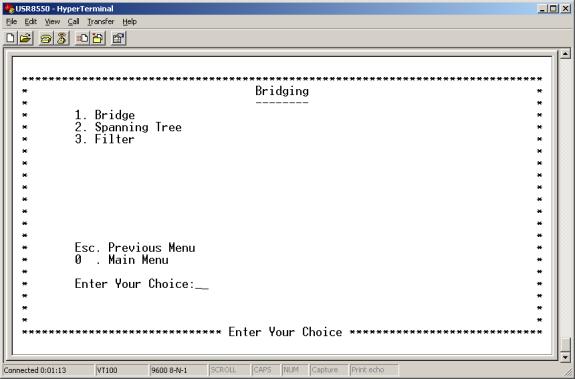 Enter 9 at the Advanced Menu. The Bridging Menu appears. This menu provides the following options…