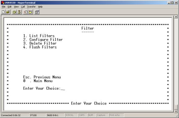 Enter 3 at the Bridging Menu. The Filter Menu appears. This menu allows you to list, configure, delete, or flush filters.