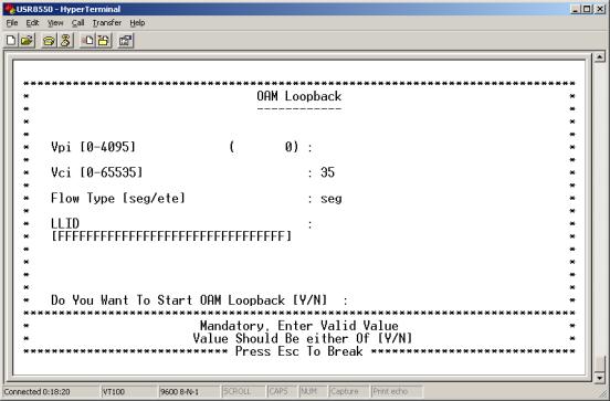 Enter 11 at the Advanced Menu. The Diagnostic Menu appears. To perform an OAM loopback test on a VCC, enter 1. To perform a ping test, enter 2.